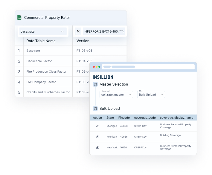 Every time a Rater‑Excel is uploaded, Insillion versions it. Each version is linked to in‑force policies, captures inputs, outputs, and rating logic, and supports rollback or comparison ensuring full traceability and governance.